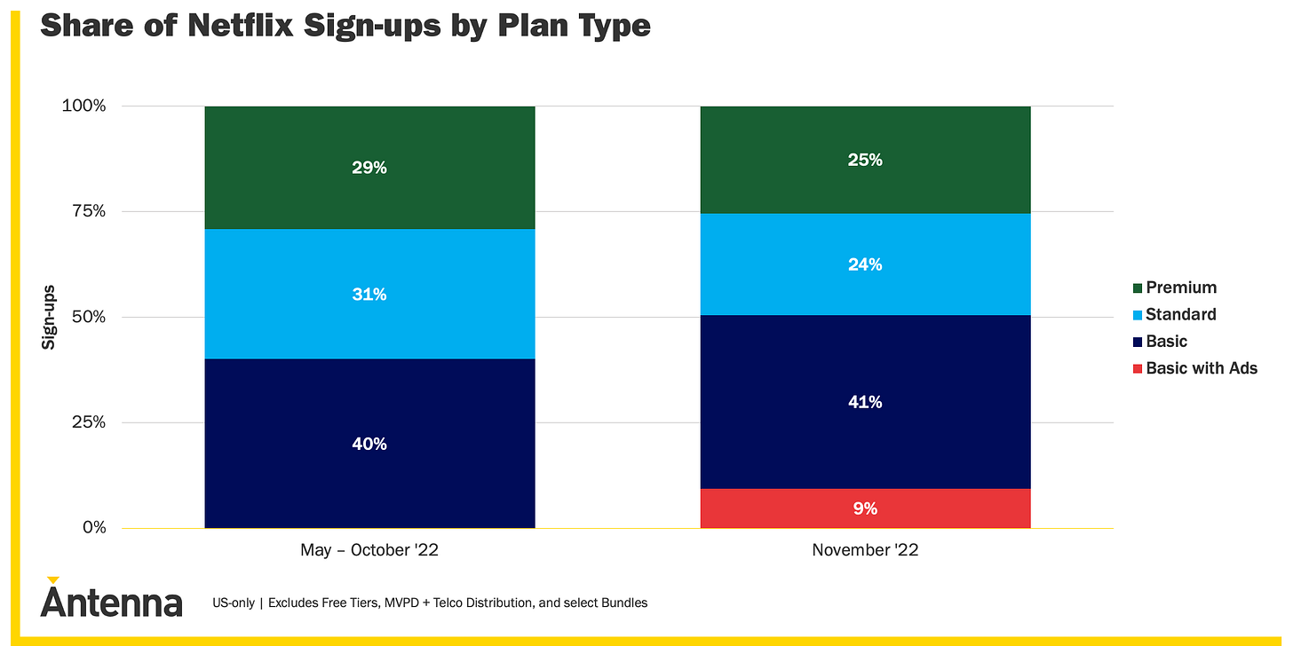 When Netflix launched the ad-supported plan, only 0.1% of existing users made the switch, but 9% of new users chose it (see below). A look at other streaming platforms suggests the share will increase over time: Hulu has 57%, Paramount+ 44%, Peacock 76% and HBO Max 21% of subscribers on ad-support plans.