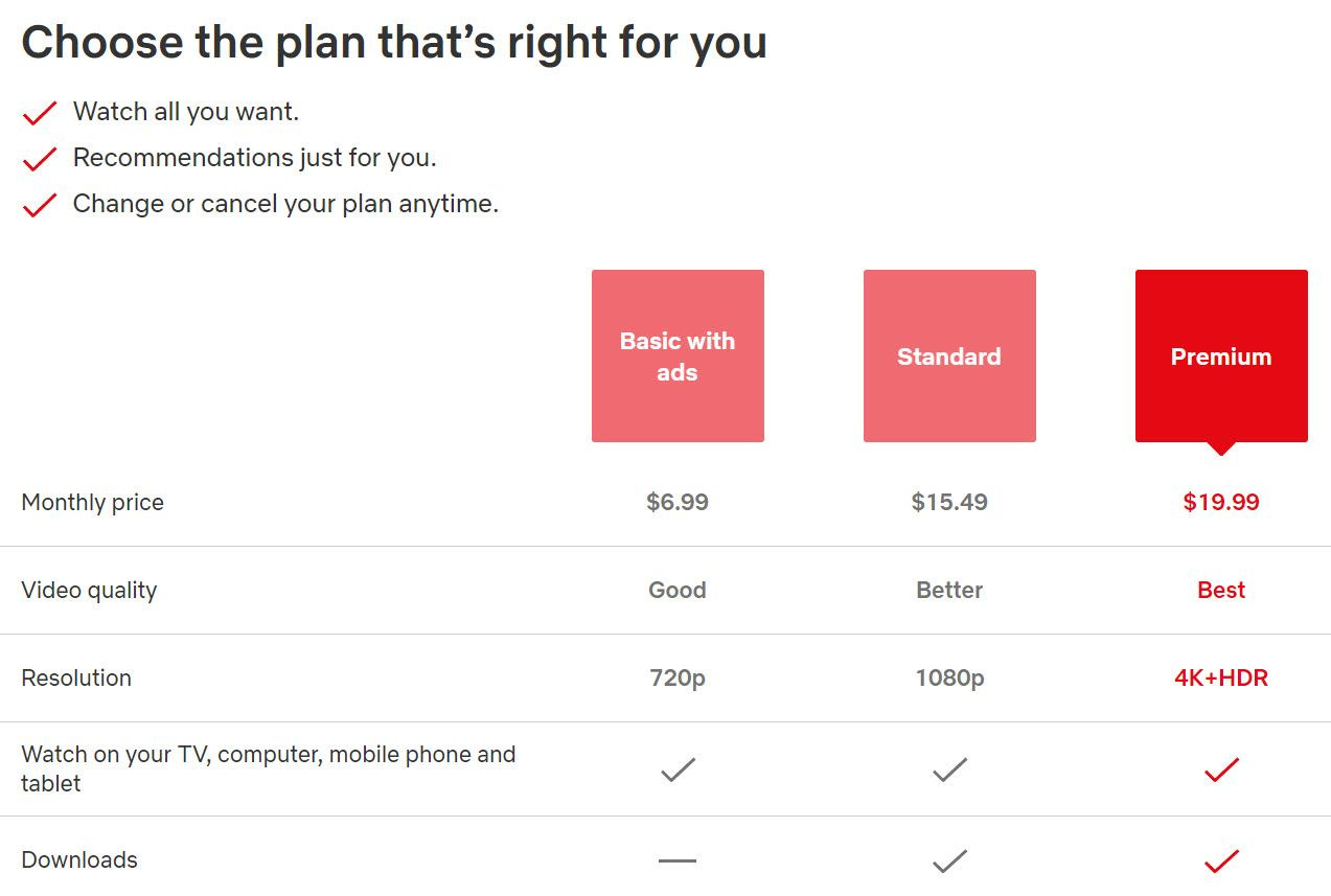 On November 3rd, 2022, Netflix launched an ad-supported plan for $6.99/month on top of its standard and premium plans (see below). During the pandemic, Netflix's subscriber numbers skyrocketed but came back to earth like Falcon 9 when Covid receded.